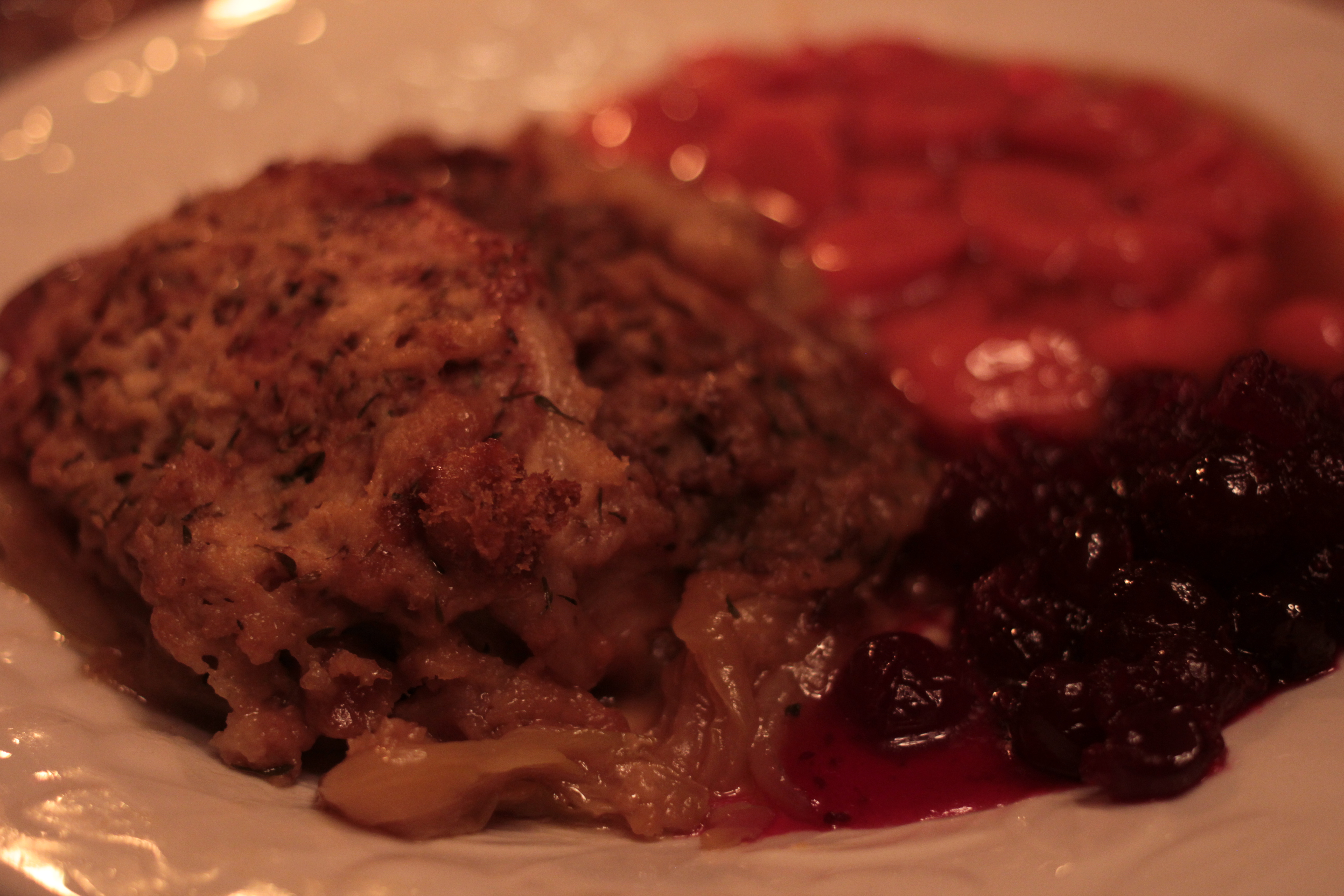 One of my favorite dishes is stuffed pork chops. I bake them on a bed of onions and apples…sprinkle the chops with tenderizer, stuff them, top them with seasoned bread crumbs, strips of bacon, and let them cook. You can add baby carrots to the pan and have a one pot meal. When you pull it out of the oven, it’s moist and tender enough to eat with a fork. It’s perfect with glazed carrots or baked butternut squash and cranberry sauce. (I cooked it in my apartment oven (formerly known as Satan because it burned 18 innocent cookies) and it turned out great, so there’s no need to think you need convection or a magic wand, because you don’t.