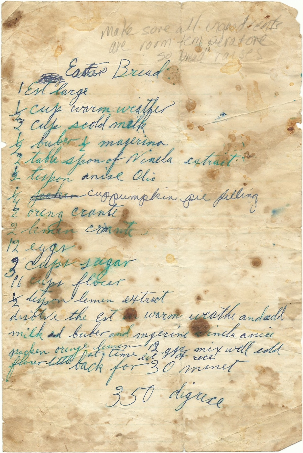 April 17, 2025I am hosting Easter on Sunday. I’ve bought almost everything I could think of, so since Easter is a few days away, and I was feeling both nostalgic and brave, I thought I’d give my mom’s original Easter Bread recipe a try. This meant putting my faith in Mom’s words on a yellowed, grease-spotted paper that’s more than 40 years old. I found the spots reassuring thinking she…