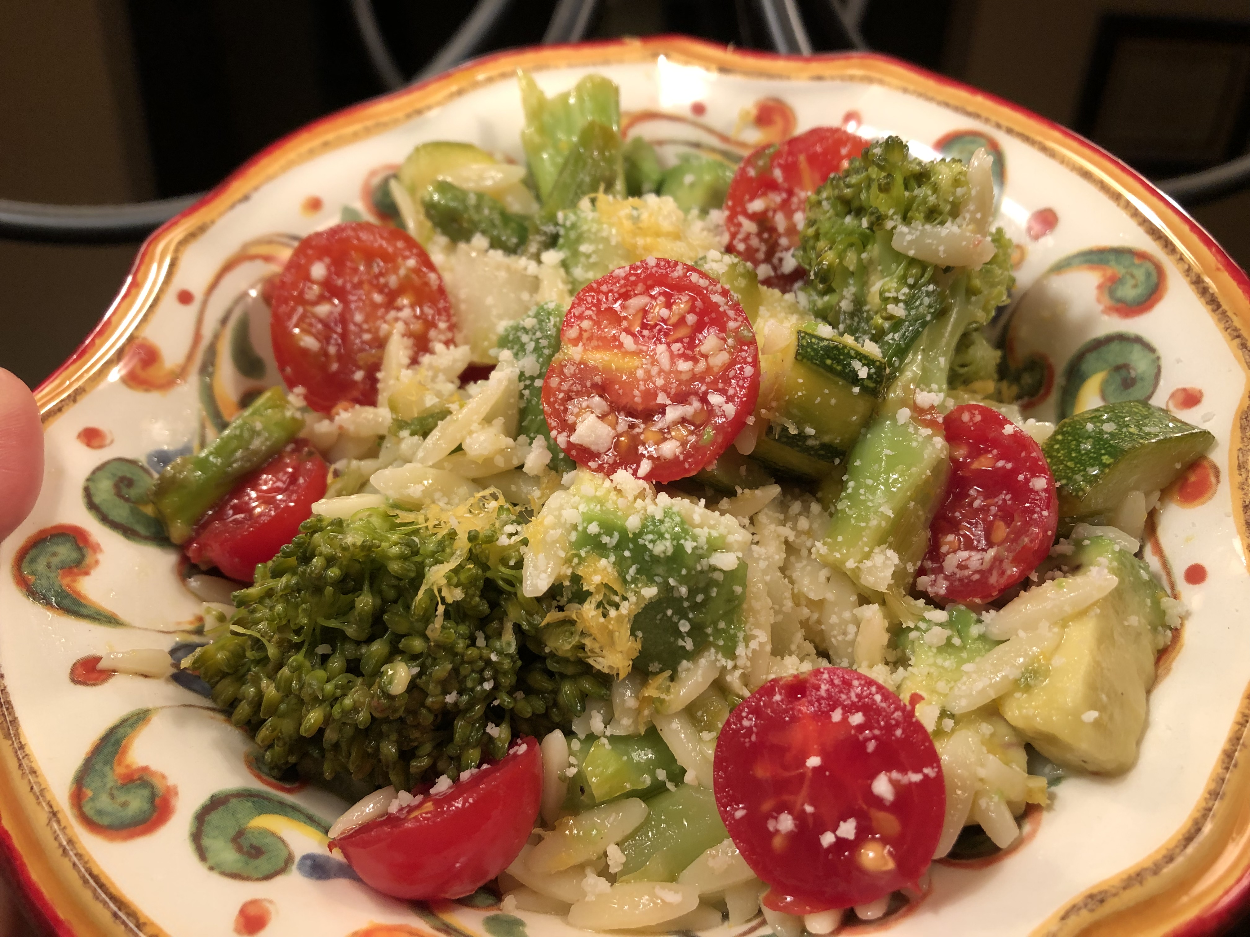 Place the orzo in a large mixing bowl. Add the broccoli, the onions and asparagus. Sprinkle it with the lemon zest. Cut the avocado into 1 inch chunks and add it to the mixture. Drizzle with one tablespoon of olive oil and toss to combine. Sprinkle with salt and pepper and serve cold. Drizzle with grated cheese, if desired.